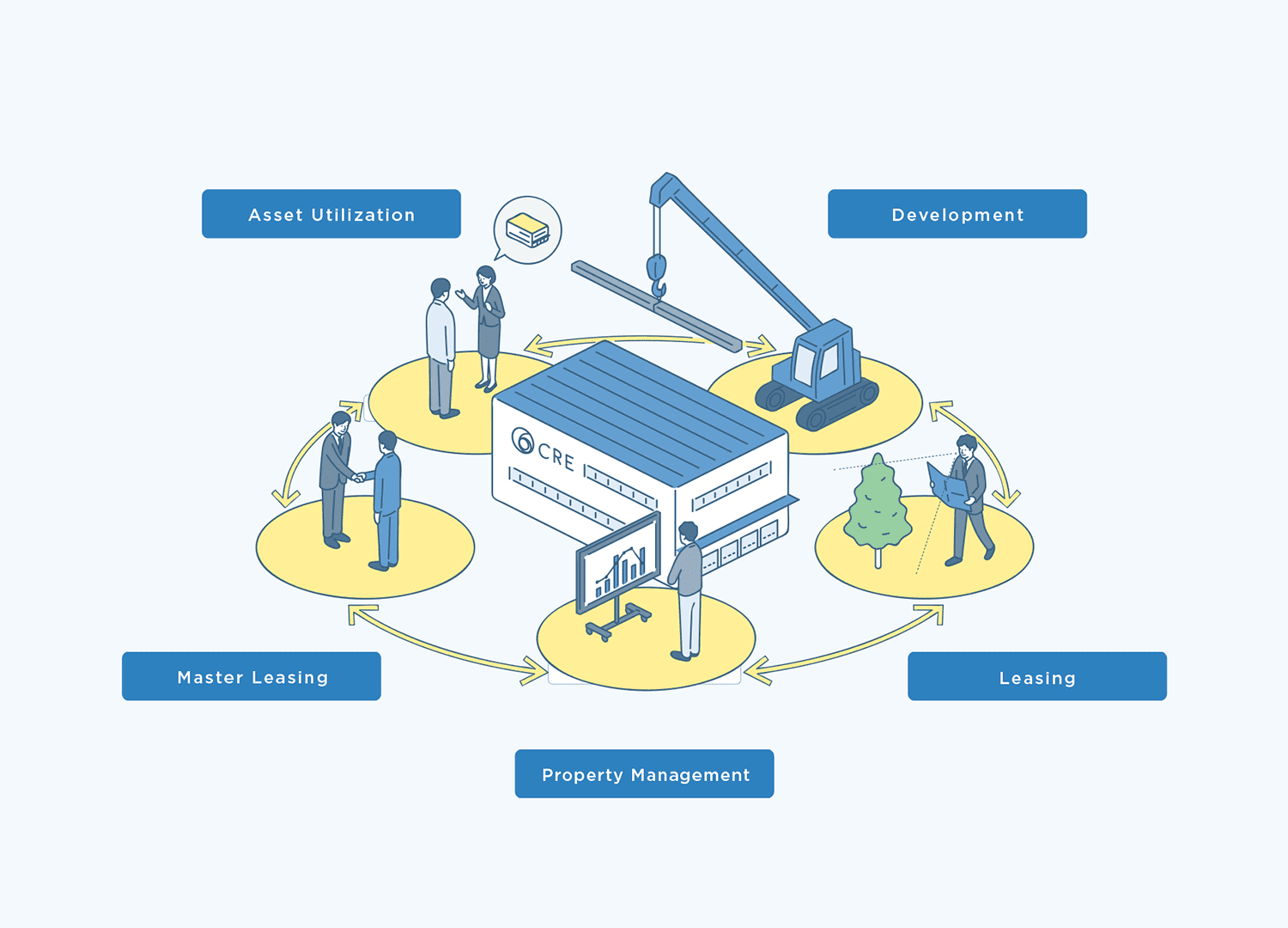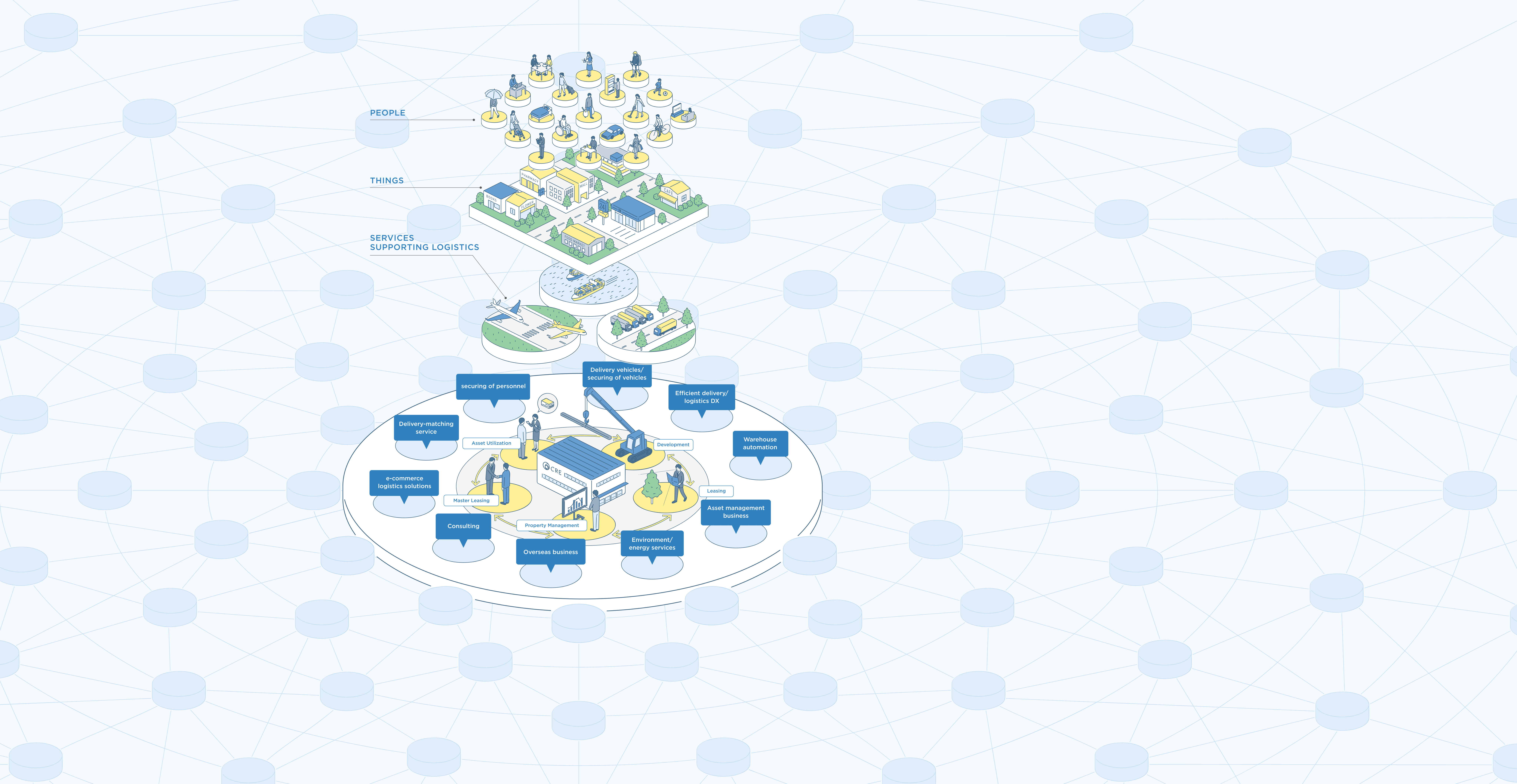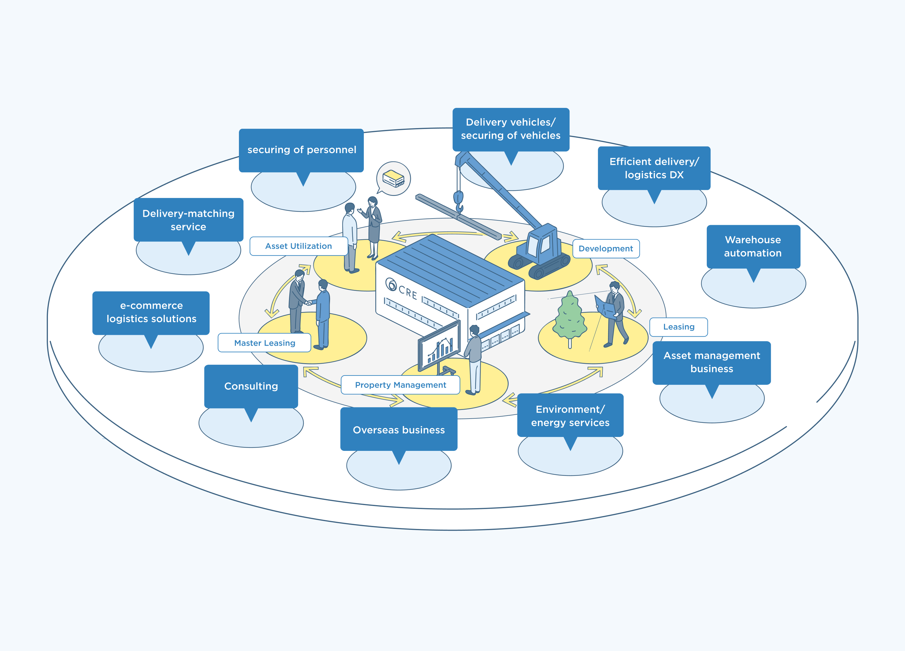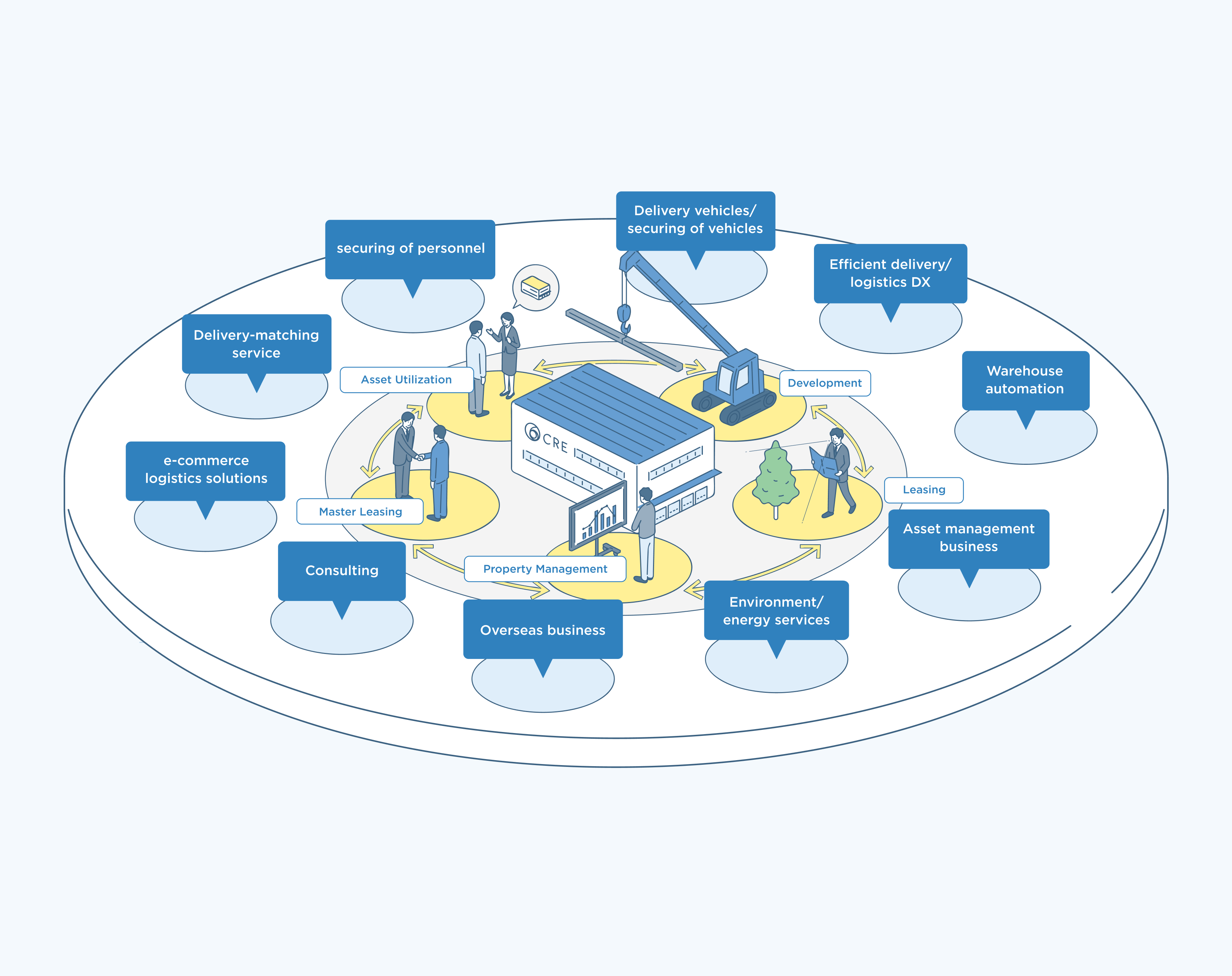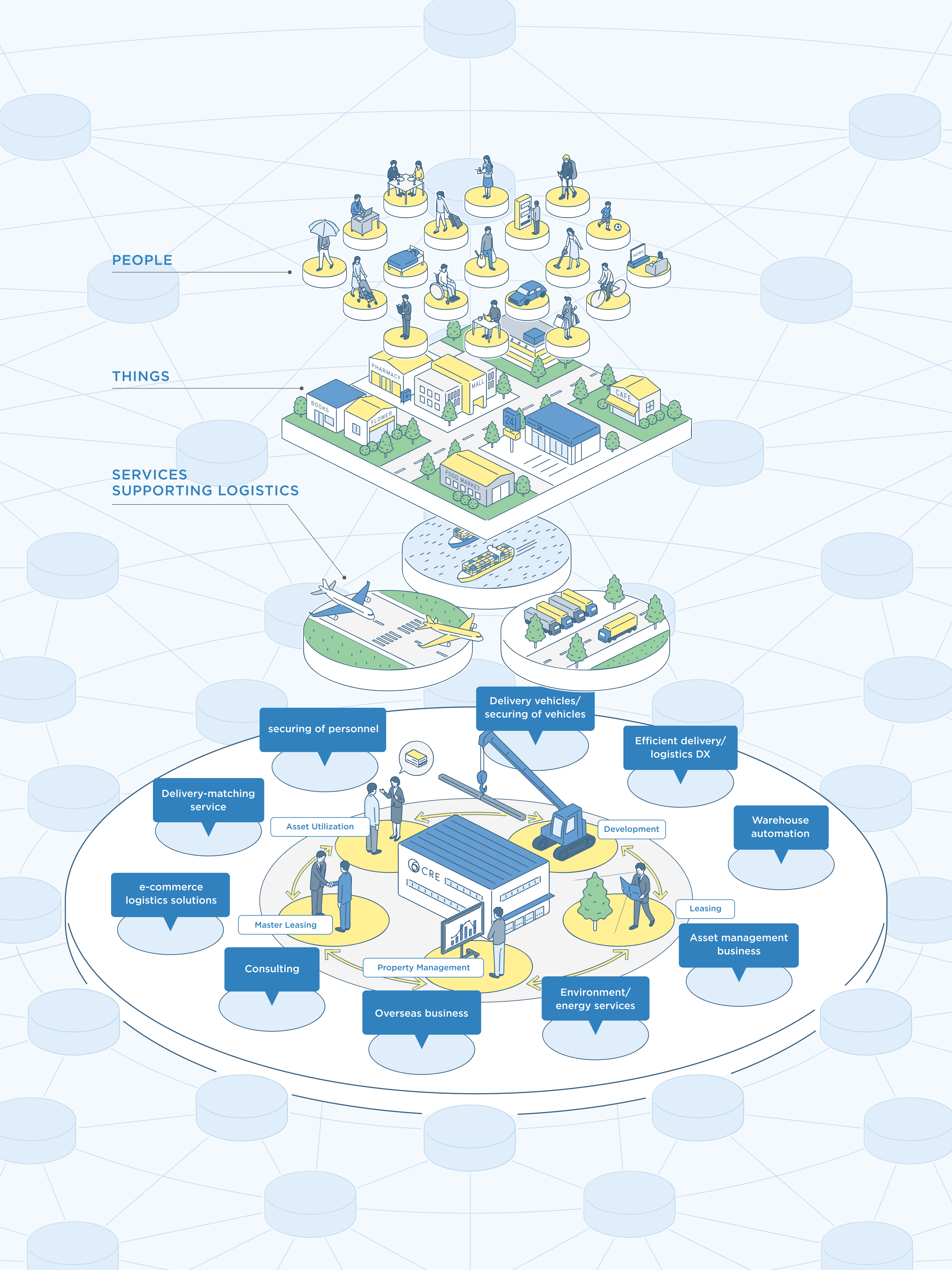 Going forward, the CRE Group will go beyond logistics real estate, complementing this with services that enhance the utility of such properties. As a corporate group, we will offer an enriched lineup of services that work as a Logistics Infrastructure Platform of integrated services.