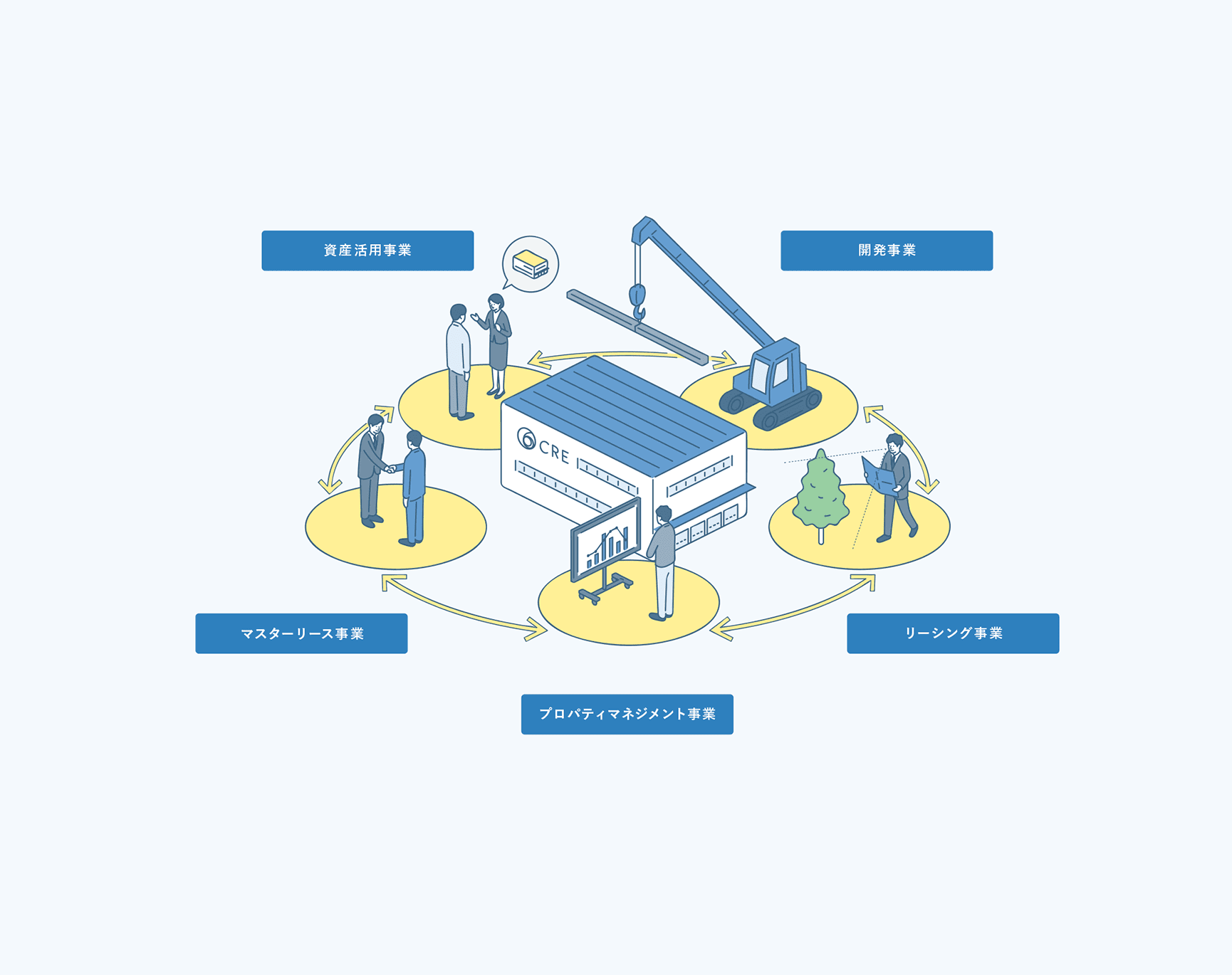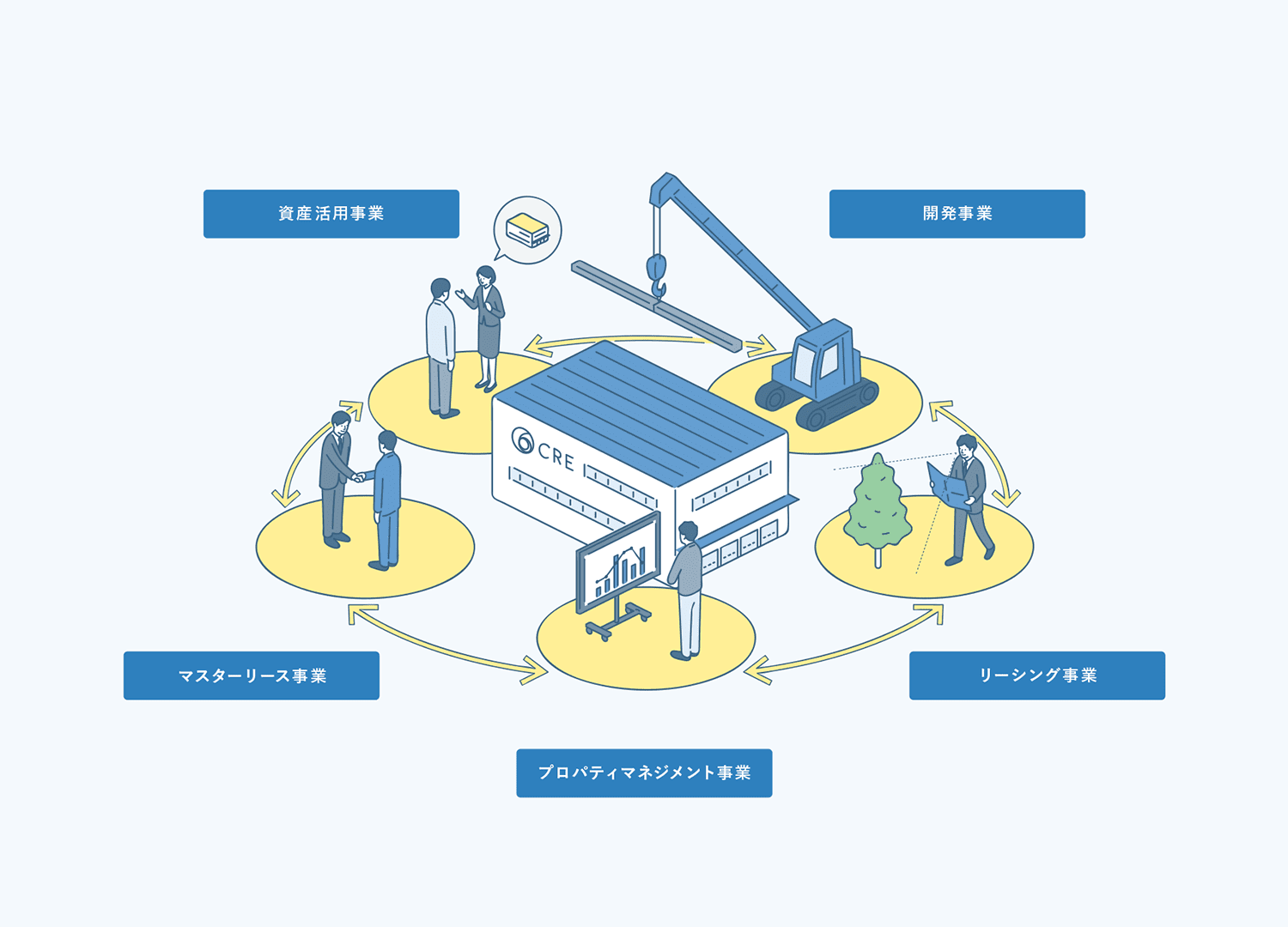 物流不動産を⼀括で借り上げ、資産価値を⾼める「マスターリース事業」を起点に成⻑を遂げてきたCREグループ。現在に至るまでに業容を拡大し、物流不動産に関わる幅広いサービスをワンストップで提供できる基盤を構築してきました。